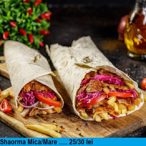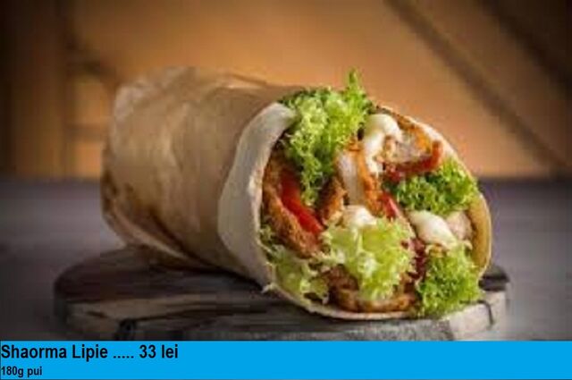 • Shaorma suculentă, bine condimentată, cu carne fragedă, legume proaspete și lipie moale.