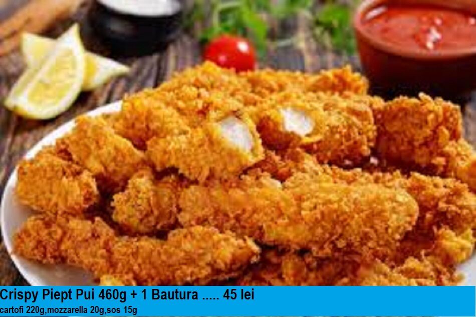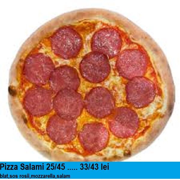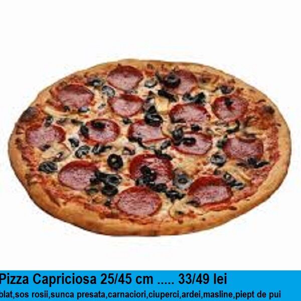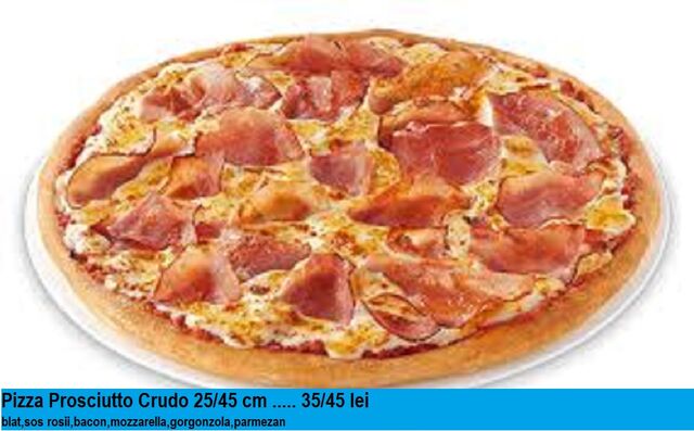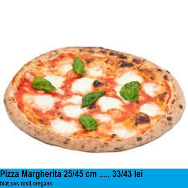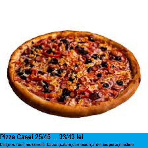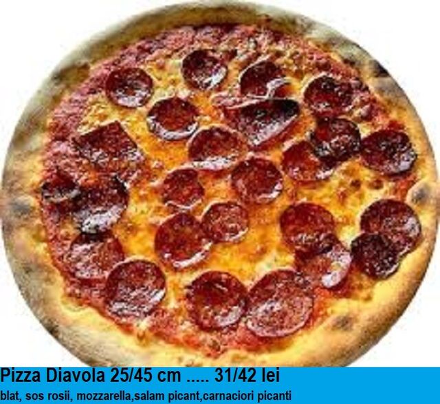 • Pizza aromată, cu blat crocant și ingrediente proaspete – mozzarella, roșii, legume, carne la alegere (șuncă, salam, bacon etc.).